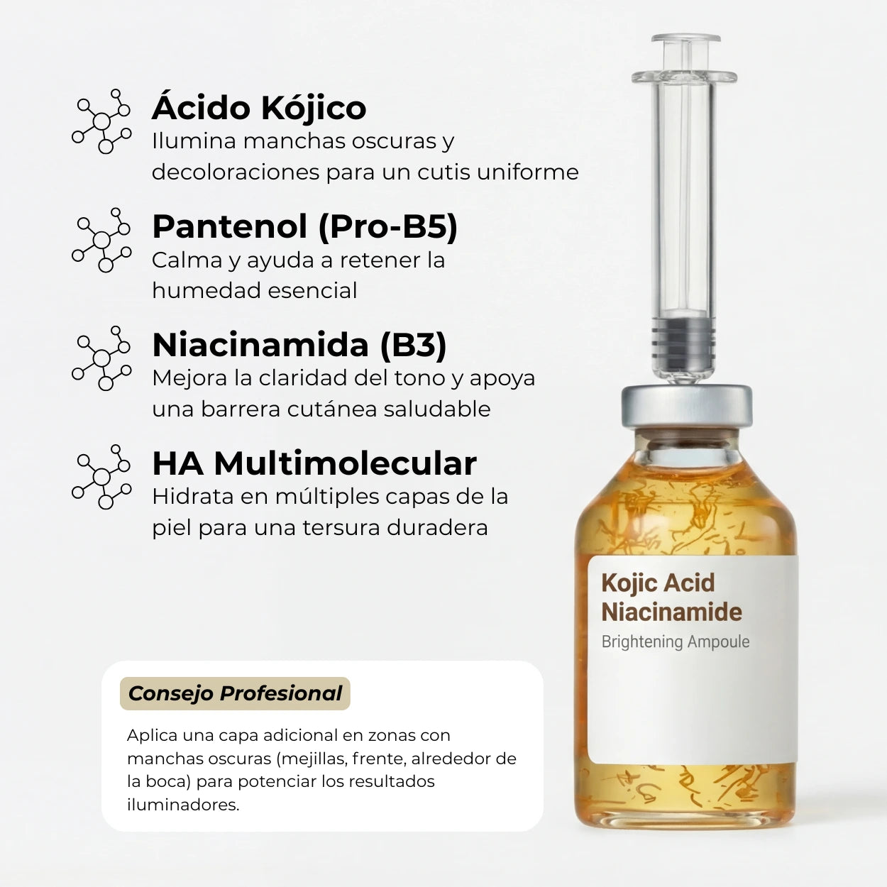 Esta ampolla iluminadora de alto rendimiento combina dos de los activos correctores de tono más confiables del cuidado de la piel — Ácido Kójico y Niacinamida — con soporte de hidratación profunda del Ácido Hialurónico multimolecular y el calmante Pantenol. El resultado es una piel que luce más clara, uniforme y visiblemente más saludable con cada uso.