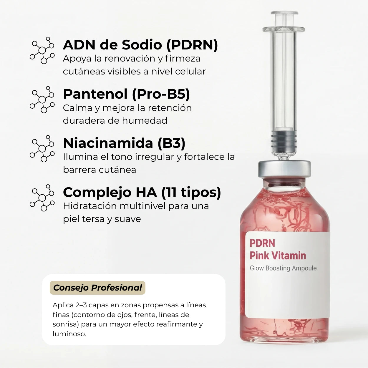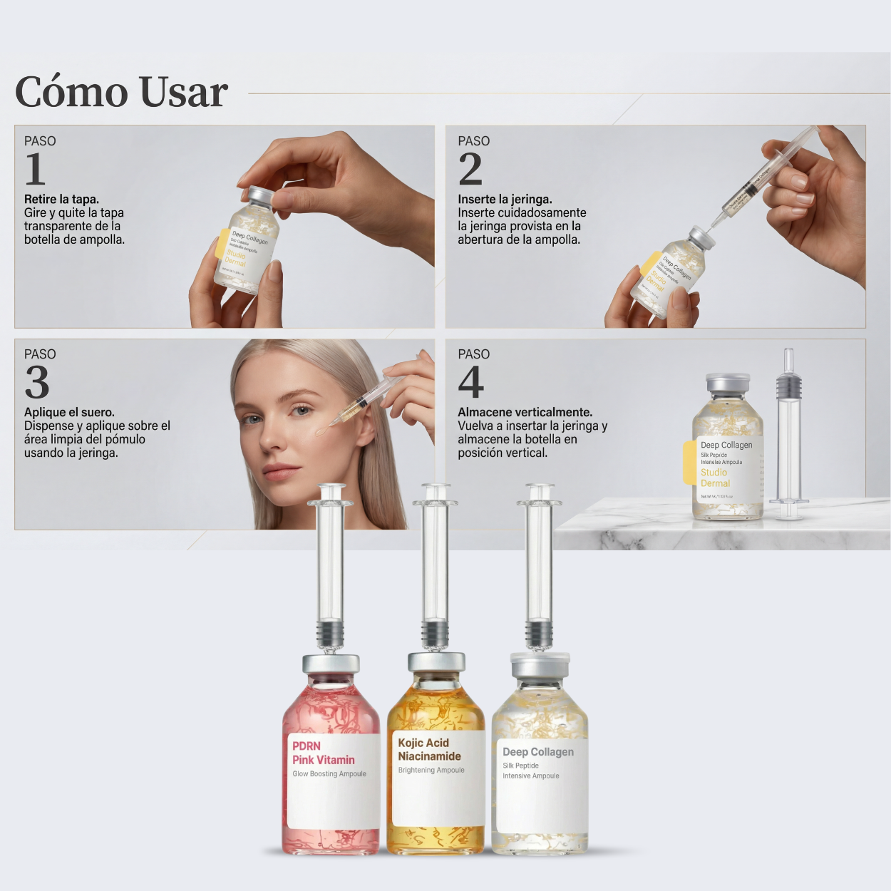 Para mejores resultados, aplica en este orden: 01 Colágeno Profundo → 02 PDRN Pink Vitamin → 03 Iluminadora Kójica. Continúa con tu hidratante y SPF por la mañana.