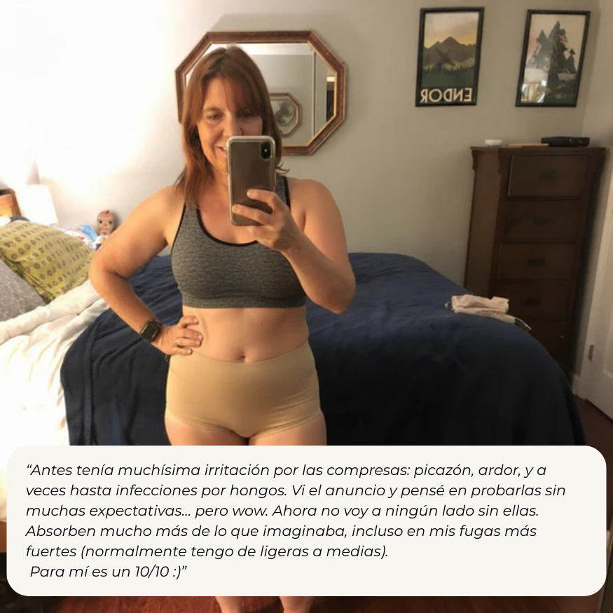 "Solía tener muchísima irritación ahí abajo por las compresas, siempre con picazón y dolor, y de vez en cuando terminaba en una infección por hongos. Vi el anuncio y pensé “¿por qué no?”, no esperaba que hiciera gran cosa, pero wow. Ahora no voy a ningún lado sin estas. Absorben mucho más de lo que pensé, incluso cuando tengo esas fugas más fuertes (las mías suelen ser de leves a medianas)."